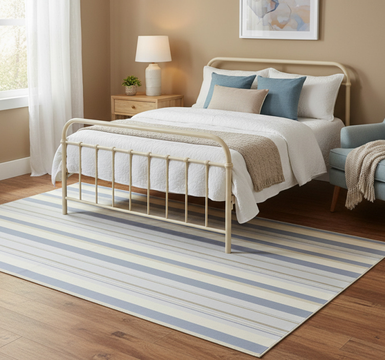 The Bedroom vinyl rug in 80's blue and beige stripes bedroom vinyl rug is not just a floor covering; it is an artistic expression that elevates your interior decor. Imagine stepping onto a piece that combines nostalgia with contemporary flair, seamlessly fitting into your bedroom's aesthetic. This rug adds a playful yet elegant touch, making it the perfect addition to create a cozy and inviting atmosphere!