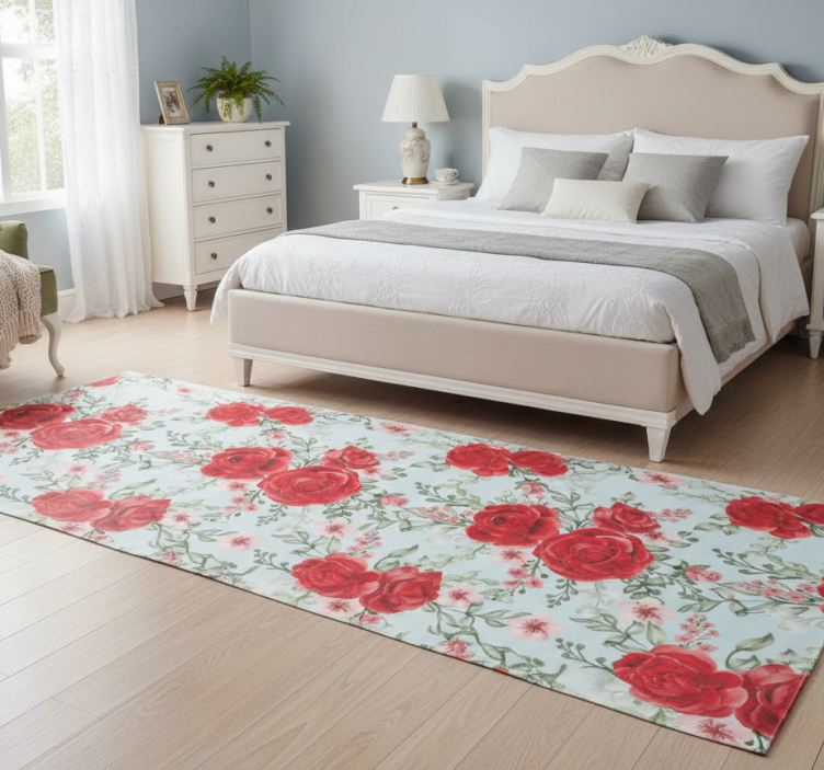 Elevate your interior with the Bedroom vinyl rug in grandmillennial floral style bedroom vinyl rug, an enchanting piece that brings warmth and character to any room. Its beautiful floral motifs create a lovely focal point, inspiring a cozy atmosphere that welcomes both relaxation and conversation. This rug is the perfect addition to your decor, effortlessly combining style with functionality!