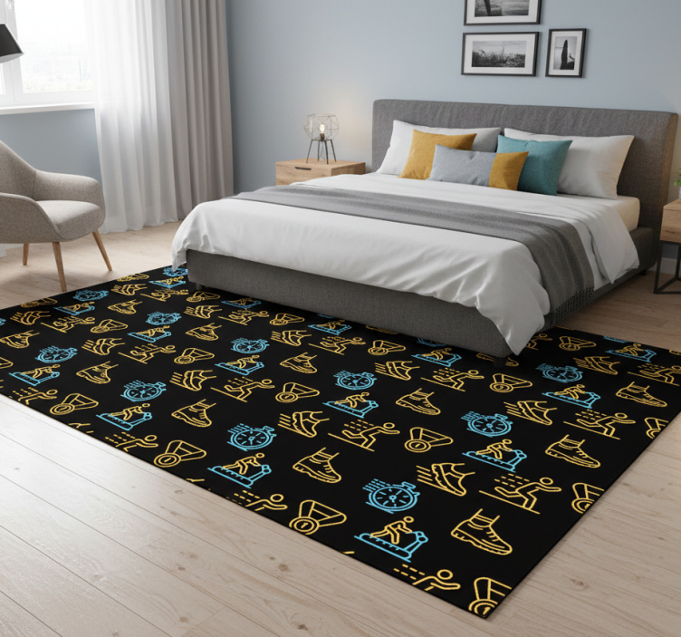 Reference: R23875Transform your space with our stunning Bedroom vinyl rug with neon vector icons on black! This eye-catching design features vibrant neon icons set against a sleek black backdrop, creating a trendy and modern aesthetic that instantly elevates any bedroom. The playful graphics bring a burst of energy to your decor, making it an ideal choice for those looking to express their unique style.