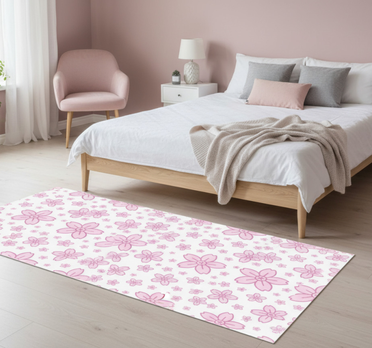 Caring for your Bedroom vinyl rug with pink cute flowers on white bedroom vinyl rug is a breeze! Simply wipe it down with a damp cloth or use a mild cleaning solution for any stubborn stains. Its durable construction ensures that it remains vibrant and beautiful, making maintenance effortless and quick!