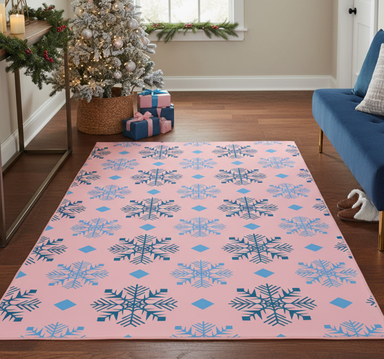The Christmas vinyl rug in pink and blue snowflakes Christmas vinyl rug is an enchanting addition to your holiday decor. Its cheerful design not only enhances your living space but also brings a touch of magic to your festivities. Whether it's a cozy corner or a bustling family room, this rug sets the perfect backdrop for creating memories with loved ones. Embrace the joy of the season with this stylish and festive piece!