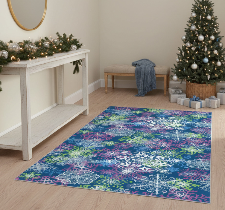 Caring for your Christmas vinyl rug with glowing snowflakes on blue Christmas vinyl rug is a breeze! Simply wipe it down with a damp cloth or use a mild detergent for tougher stains. Its easy-to-clean surface ensures that your rug stays vibrant and fresh throughout the holiday season.