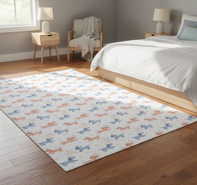 Reference: R23868Transform your space with the delightful Cute dogs with crown bedroom vinyl rug, featuring an adorable design that showcases charming pups wearing crowns. Its vibrant colors and playful graphics create a whimsical atmosphere, making it the perfect addition to any bedroom. The rug is not only visually appealing but also crafted with high-quality materials that ensure durability and comfort.
