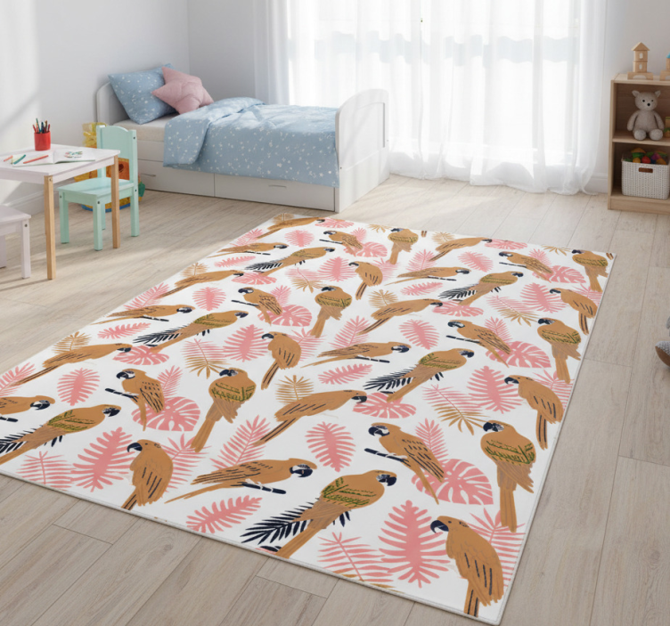 Keeping your Orange parrots with pink flowers animal vinyl rug looking fresh is a breeze! Simply wipe it down with a damp cloth or use a mild detergent for tougher stains. Its easy-to-clean surface ensures that your vibrant rug remains a beautiful focal point in your home!