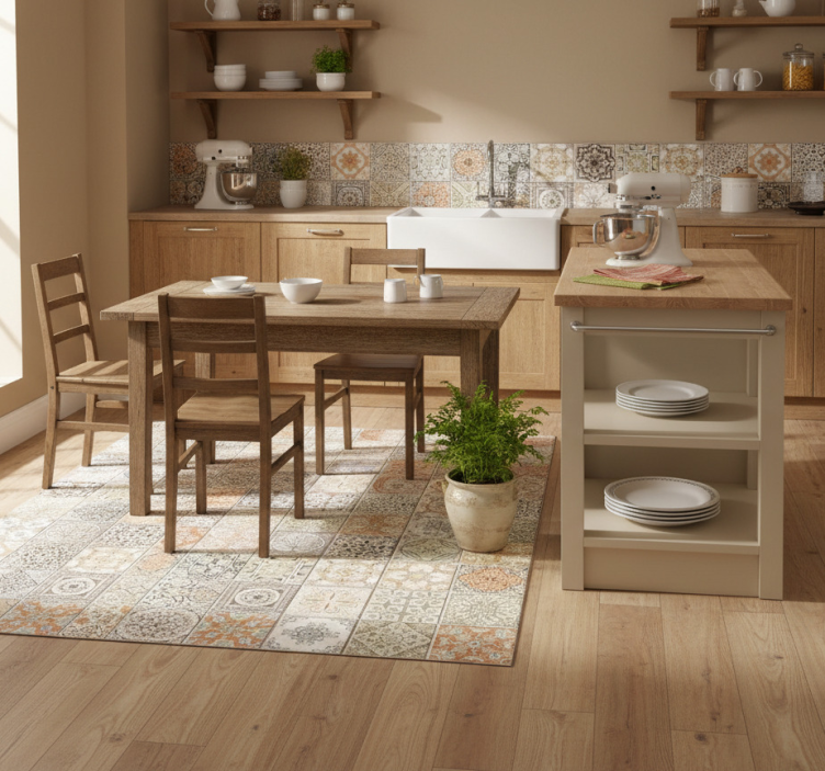 Reference: R19844Transform your kitchen into a warm and inviting space with our Vintage warm collage kitchen vinyl rug. This exquisite rug features a stunning design that beautifully combines vintage aesthetics with a warm color palette, creating a collage that adds character and charm to any kitchen environment. Its eye-catching graphics make it a perfect focal point, seamlessly enhancing your home decor while offering functionality.