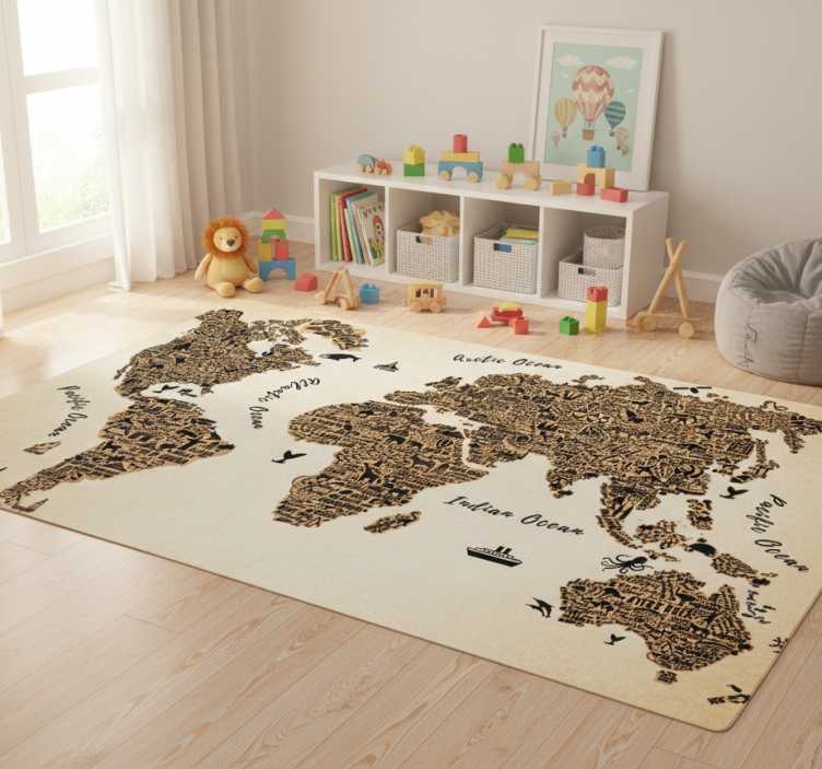 The World map vinyl rug with text outline design world map vinyl rug is the perfect addition to any decor style, whether you're aiming for a cozy ambiance or a chic modern look. Its eye-catching design allows you to express your love for travel and adventure, inviting an inspiring atmosphere into your home. This rug serves not just as a decorative piece, but as a vibrant focal point that uplifts your space!