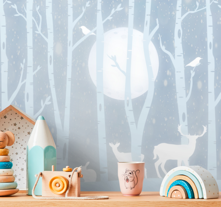 Transform your child’s space with our enchanting Childrens wall mural deer and moon, where the beauty of the forest comes alive! This exquisite design features painted trees, charming deer, and delightful birds, all set against a mesmerizing night sky illuminated by the moon. It captures the essence of wildlife in a playful yet serene manner, perfect for sparking your child's imagination!