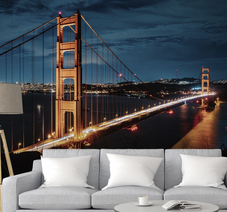 Transform your space with our stunning City wall mural golden gate bridge at night. Featuring a breathtaking depiction of the iconic Golden Gate Bridge enveloped in a serene night scene, this mural captures the enchanting glow of the city lights as they twinkle against the backdrop of a darkened sky. The artistic representation of the bridge and its surroundings brings a touch of urban sophistication and tranquility to any room, making it a perfect choice for those who appreciate the beauty of cityscapes after dusk.