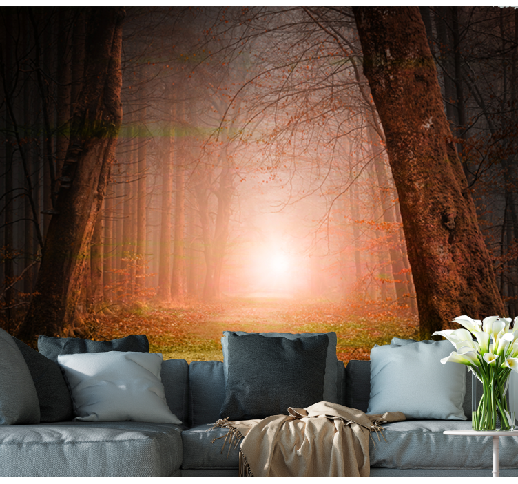 Transform your space with the captivating Enigmatic Woodland Trail forest wall mural, where the beauty of a sunlit forest meets the serenity of fog-covered paths. This enchanting design features vibrant trees bathed in golden sunshine and autumn hues, inviting nature's charm into your home. As you gaze at the sunburst filtering through the leaves, you can almost hear the whispers of the forest, creating a perfect atmosphere of tranquility and warmth.