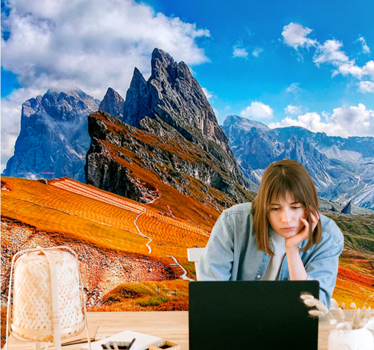 Transform your space with our Landscape wall mural mountain peaks view, a stunning depiction of rocky mountains and lush hills that breathe life into any room. The breathtaking scenery, complete with wispy clouds and captivating nature elements, invites you to escape into a world of tranquility and beauty. This mural is not just a decoration; it's a statement piece that brings the serene essence of the mountains into your home!