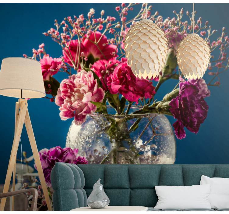 Transform your living space with the enchanting Lively bloom composition flower wall mural. This stunning design features a captivating array of clove and glass elements, beautifully interwoven with vibrant flowers and delicate carnations. The botanical flora is elegantly presented in a charming vase, adorned with glistening droplets that add a touch of serenity and freshness to any room. Let this exquisite mural breathe life into your walls and elevate your home décor!
