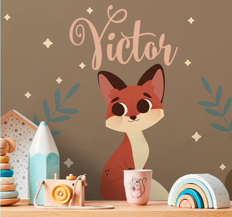 Reference: F9831A charming fox character with oversized eyes and a playful demeanor, surrounded by delicate foliage and stars. The design features the name 'Victor', adding a personalized touch to this delightful motif, perfect for children's spaces or playful areas.
