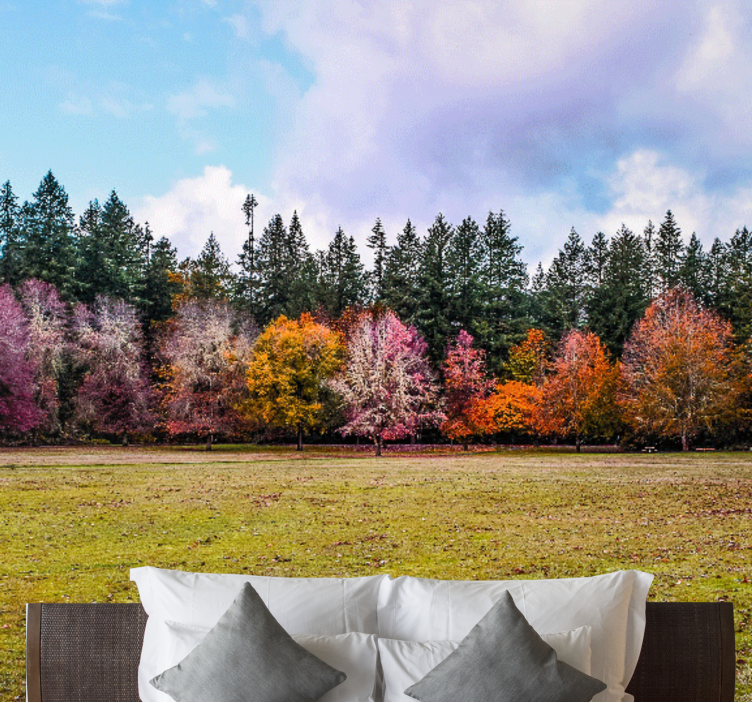 Transform your space into a vibrant retreat with our Wall mural nature colorful autumn forest. This stunning design showcases a breathtaking landscape filled with colorful trees and a serene forest, capturing the essence of autumn in all its glory. The rich photography brings the field to life, inviting the beauty of nature right into your home!