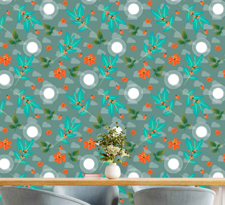 The Floral Geometric wallpaper for dining area features a stunning design incorporating cherry, plant, coffee, pattern, flowers, geometric pattern, flora, circular accents, orange blooms, and a green background. The combination of these elements creates a visually striking and unique wallpaper that will add a touch of elegance to any dining area.